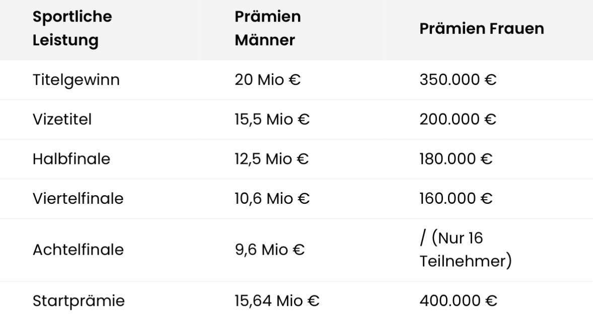 Prämie fürs Erreichen des Viertelfinales: 160.000 €.
